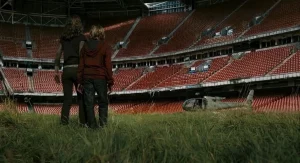 Tammy and Andy meet Flynn on the pitch of Wembley Stadium (which wasn’t actually completed at the time the film is set).