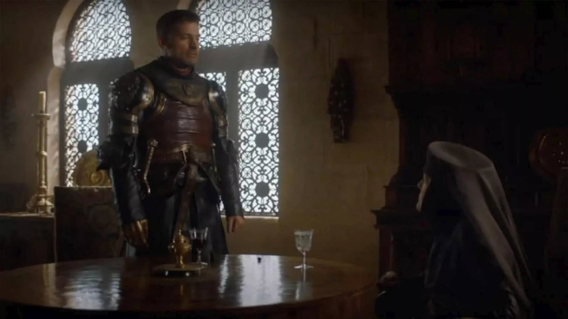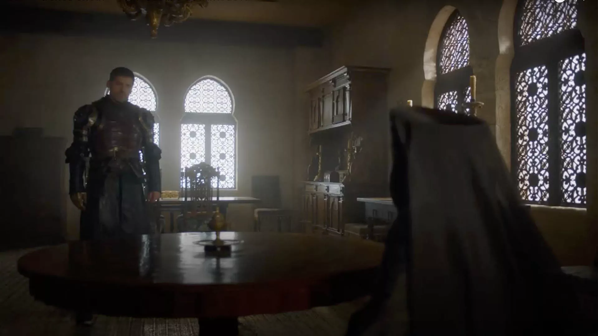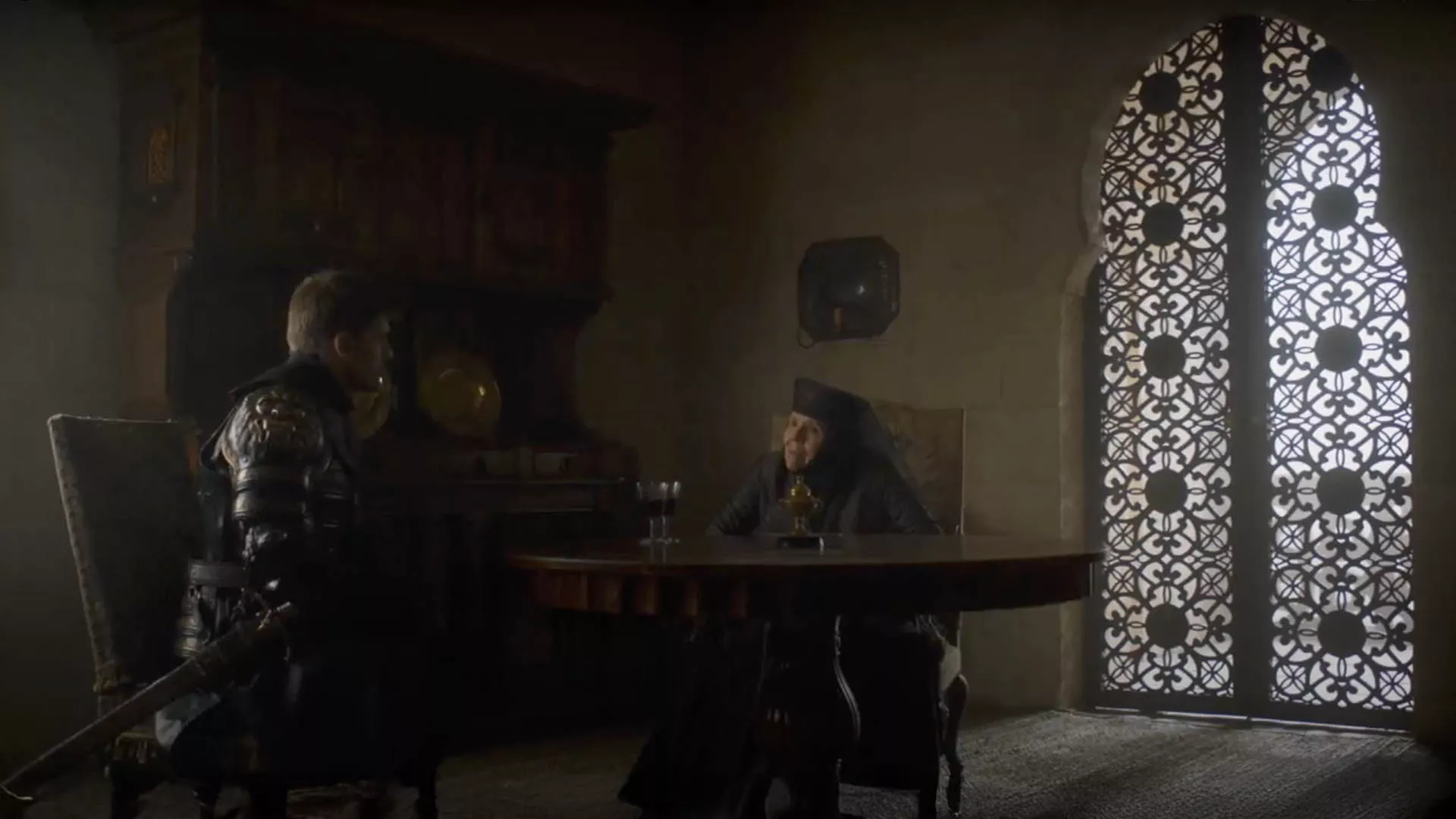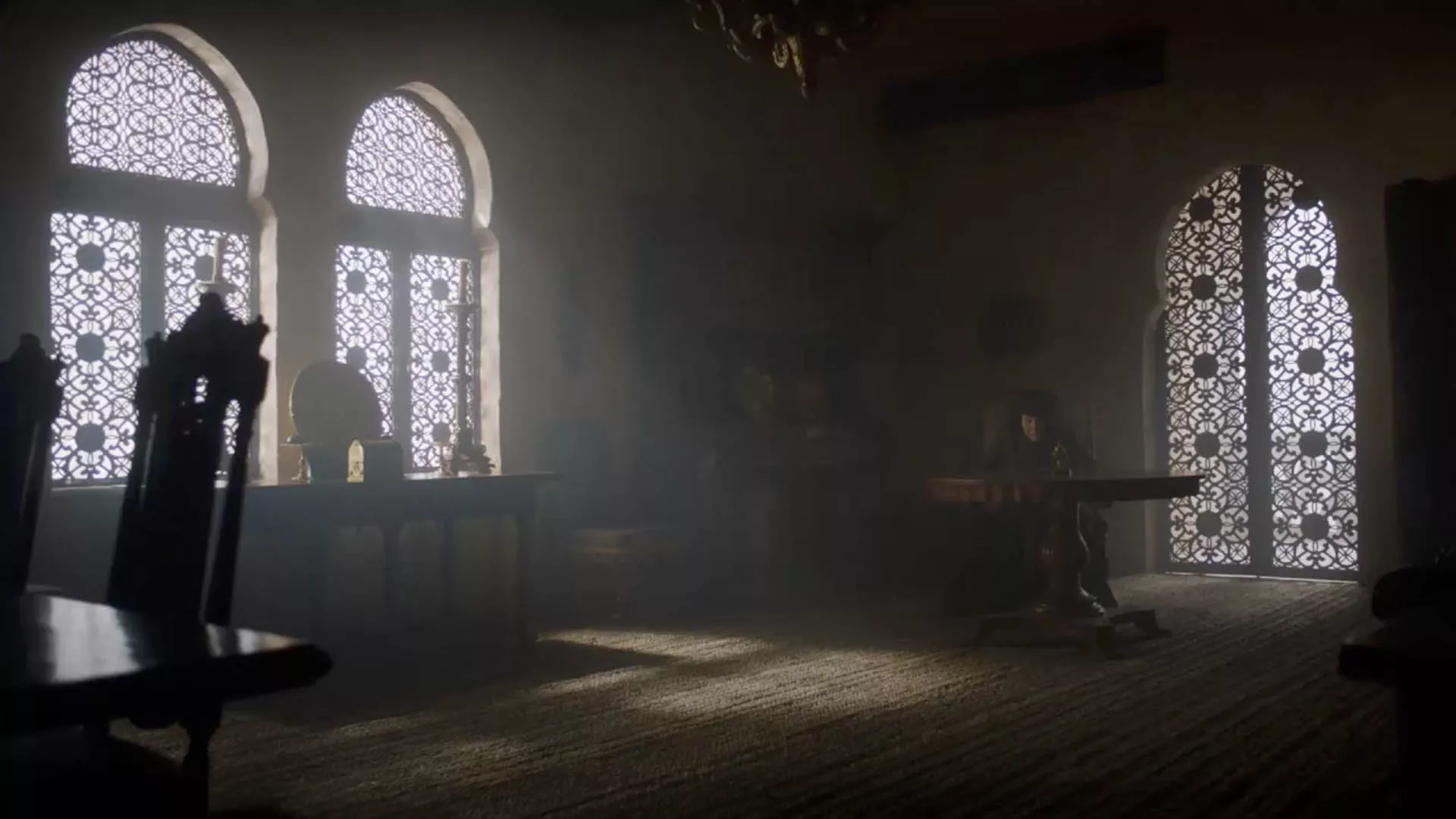 Later, after defeating the Tyrells, Jaime walks through the gardens and enters the hall where Olenna Tyrell, portrayed by Diana Rigg, awaits him. In their final meeting, Olenna reveals that she was the one who poisoned Joffrey Baratheon. This hall is notable for its Arab-style windows, which have survived through the centuries, adding a historical touch to the scene.
