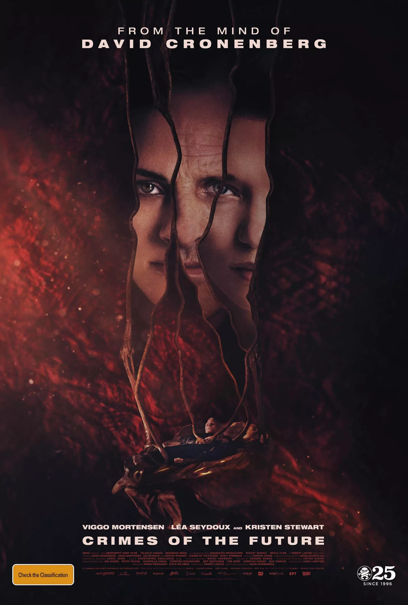 Humans adapt to a synthetic environment, with new transformations and mutations. With his partner Caprice, Saul Tenser, celebrity performance artist, publicly showcases the metamorphosis of his organs in avant-garde performances.