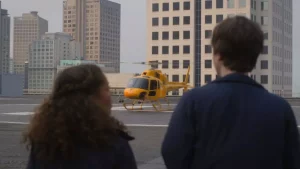 After collecting the donor liver at San Francisco Municipal Hospital, Shaun and Claire head back to the roof to fly the organ to St. Bonaventure.