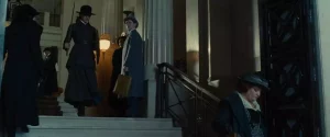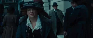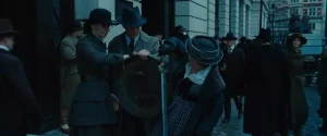 Diana struggles to get through the revolving door with her sword and shield before handing them off to Etta.